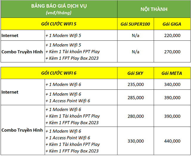 Dưới đây là bảng giá gói combo FPT tại TPHCM: