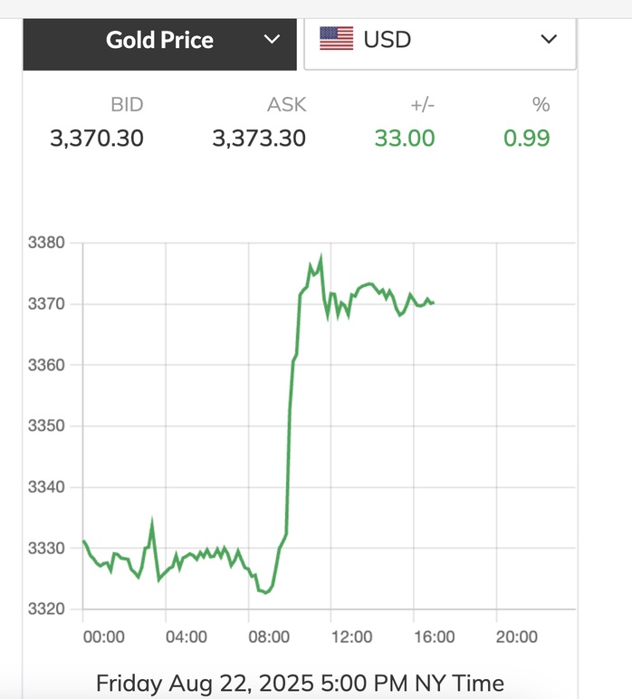 Theo giới phân tích, giá vàng nhảy vọt khi thị trường kỳ vọng rất lớn rằng Cục Dự trữ Liên bang Mỹ (FED) sẽ cắt giảm lãi suất vào tháng 9 tới khiến chỉ số đồng USD (DXY) lao dốc mạnh, có thời điểm rơi thẳng đứng khoảng 1 % sau thông tin trên. Hiện chỉ số DXY ở mức 97,7 điểm. Điều này tác động rất tích cực đến giá vàng.