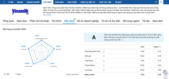 Ví dụ minh họa với cổ phiếu Vinamilk (HOSE: VNM). Theo hệ thống Fundamental Rating trên VietstockFinance thì VNM đạt điểm xếp hạng tổng thể 9.03/10 và được phân loại vào nhóm A. Điều này phản ánh nền tảng tài chính vững chắc và nhiều chỉ tiêu vượt trội so với mặt bằng ngành.