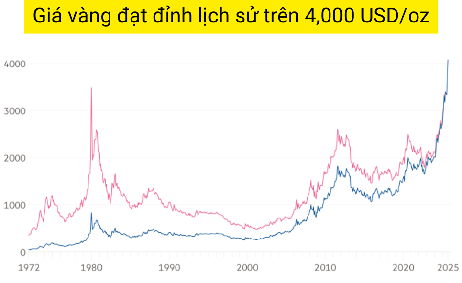 Đường màu xanh: Giá vàng ($/troy oz); đường màu đỏ: Giá thực (giá trị không đổi năm 2025). *Điều chỉnh theo lạm phát CPI của Mỹ. Nguồn: LSEG, BLS, tính toán của FT