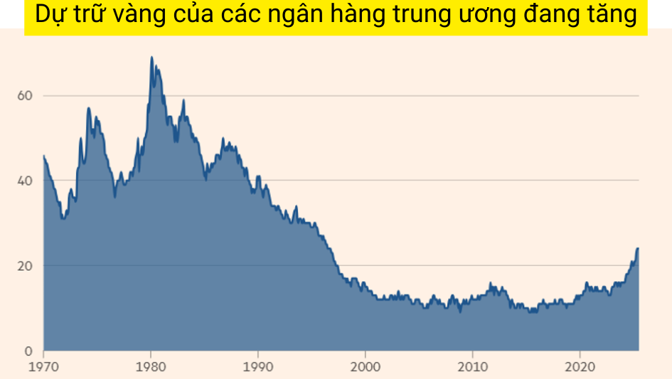 Theo dữ liệu của Hội đồng Vàng Thế giới, ngân hàng trung ương đã tăng dự trữ vàng từ 10% một thập kỷ trước lên khoảng 24% vào cuối tháng 6.