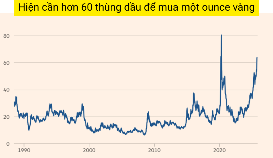 Tỷ lệ giữa vàng ($ mỗi ounce) và dầu thô ($ mỗi thùng). Nguồn: LSEG, tính toán của FT