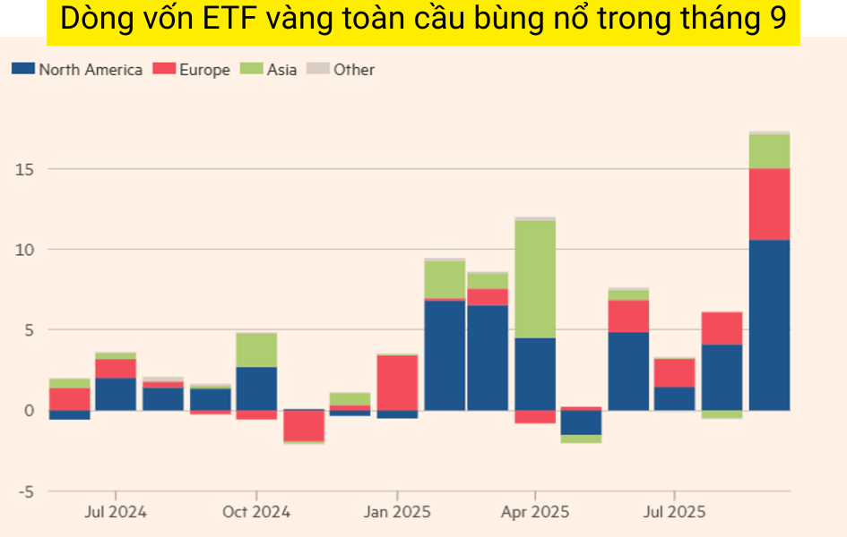 Thêm vào đó, một làn sóng mua vào gần đây hơn của các định chế và nhà đầu tư nhỏ lẻ đã gây bất ngờ cho thị trường. Cụ thể, một khoản tiền kỷ lục 26 tỷ USD đã đổ vào các quỹ ETF vàng trong quý 3. Đây là lúc một cộng đồng nhà đầu tư, vốn từ lâu hoài nghi về tài sản không sinh lời này, đã bị cuốn theo bởi điều mà một số người gọi là “cơn sốt FOMO với vàng”. Dựa trên các dòng vốn đang tăng vọt, Société Générale cho rằng việc giá vàng chạm mốc 5,000 USD/troy ounce là “ngày càng không thể tránh khỏi”.