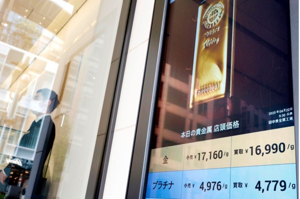 Giá vàng bán lẻ được trưng bày tại Tanaka Precious Metals ở Tokyo vào tháng 4. Nhu cầu tăng vọt đã khiến Tanaka, một trong những nhà cung cấp vàng hàng đầu Nhật Bản, phải tạm ngừng bán các thỏi vàng và bạch kim nhỏ vào tuần trước - Ảnh: Kyodo/AP