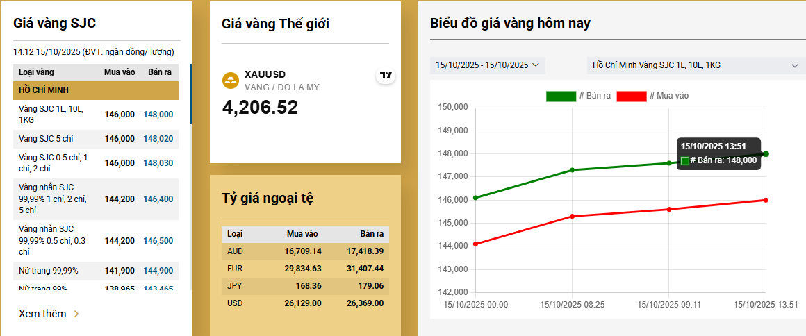 Chiều 15/10, lúc 14h12, Công ty SJC tiếp tục tăng giá mua - bán vàng miếng lên 146 - 148 triệu đồng/lượng, cùng tăng 1.9 triệu đồng so với giá mở cửa phiên sáng.