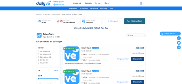Tại Dailyve, mọi thông tin về nhà xe như giá vé, thời gian khởi hành, phân loại xe, điểm đón - trả khách, đánh giá,... đều được hiển thị công khai chỉ trong một giao diện duy nhất. Không cần tốn thời gian tìm kiếm trên nhiều trang web, bạn hoàn toàn có thể so sánh và lựa chọn chuyến đi phù hợp chỉ trong vài phút. Dù ưu tiên mức giá tiết kiệm, chuyến đi tiện nghi hay hãng xe uy tín, Dailyve đều có các yếu tố so sánh, giúp mọi quyết định trở nên thông minh và dễ dàng.