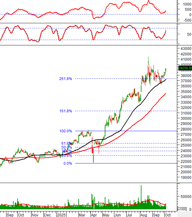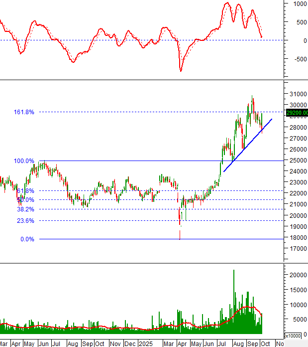 Trong phiên giao dịch ngày 06/10/2025, giá cổ phiếu HPG hồi phục mạnh mẽ sau khi chạm đường trendline ngắn hạn và một lần nữa test ngưỡng Fibonacci Retracement 161.8% (tương đương vùng 29,000-29,500). Đây sẽ là thử thách quan trọng nhất và quyết định xu hướng của HPG trong ngắn hạn.