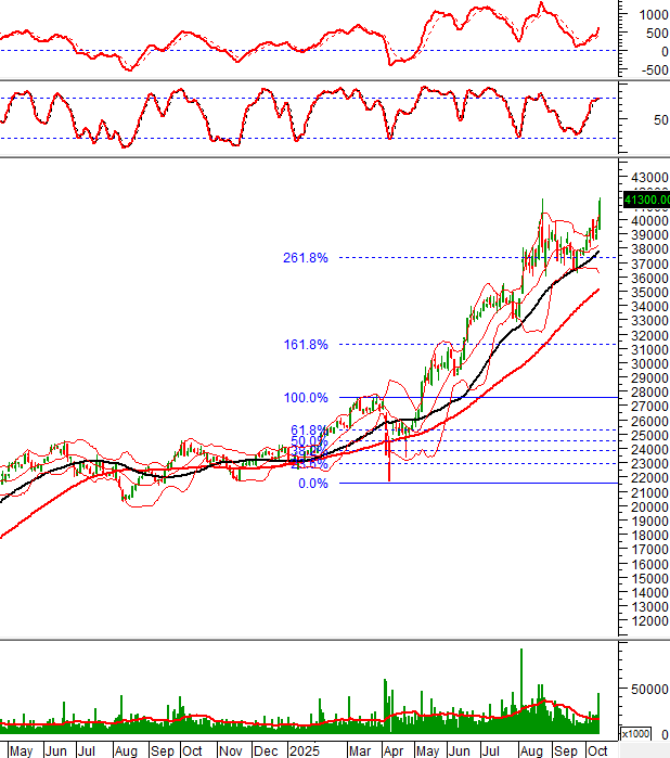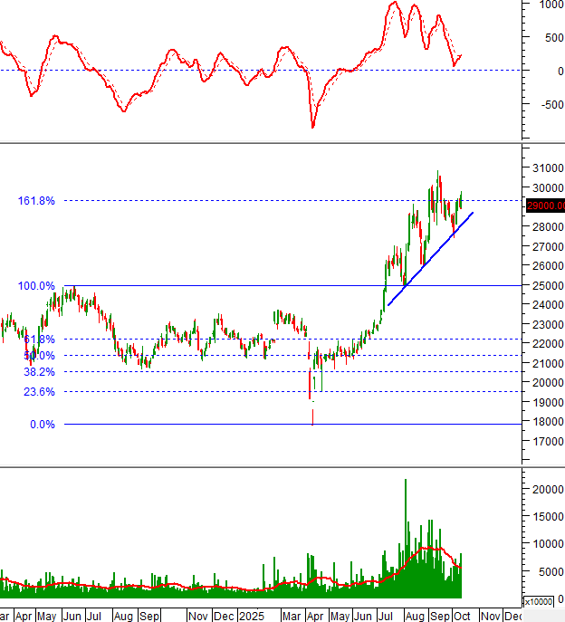 Trong phiên giao dịch ngày 13/10/2025, giá cổ phiếu HPG rung lắc mạnh và đang test ngưỡng Fibonacci Retracement 161.8% (tương đương vùng 29,000-29,500).