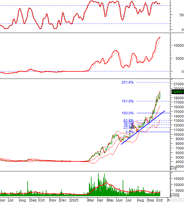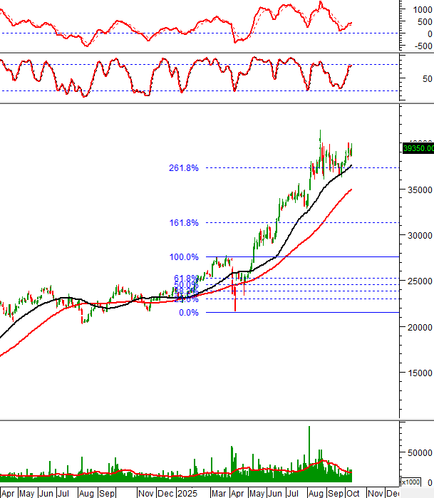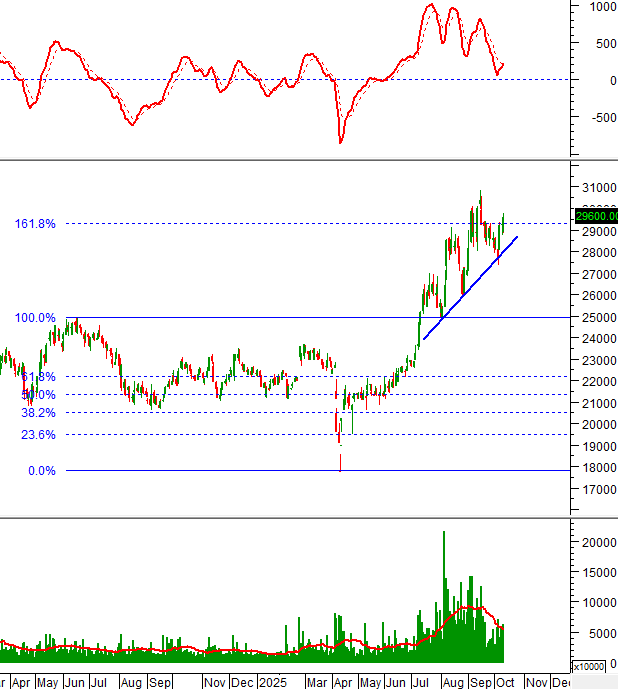Trong phiên giao dịch ngày 10/10/2025, giá cổ phiếu HPG hồi phục mạnh và vượt qua ngưỡng Fibonacci Retracement 161.8% (tương đương vùng 29,000-29,500).