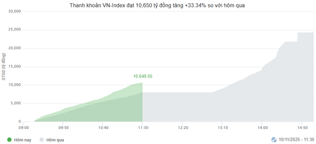 Thanh khoản thị trường đang có dấu hiệu cải thiện hơn so với phiên trước. Giá trị giao dịch của HOSE sáng nay đạt hơn 10 ngàn tỷ, tăng 33.34%, nhưng vẫn khá thấp với mức trung bình 1 tháng qua. Tương tự, giao dịch trên HNX cũng ghi nhận mức tăng 30.43% so với phiên trước, đạt hơn 43 triệu đơn vị, tương đương hơn 1 ngàn tỷ đồng.
