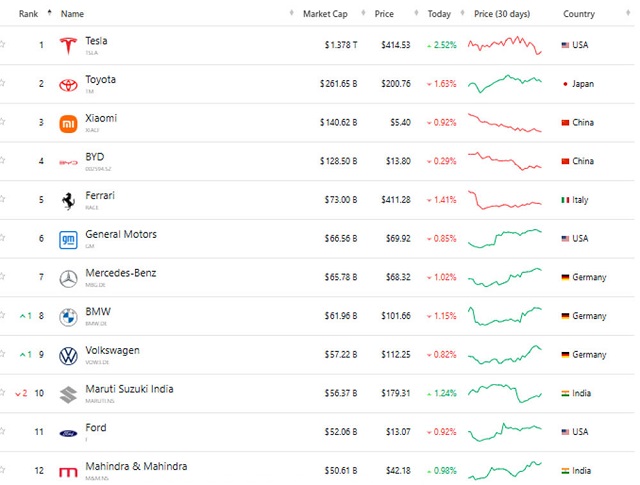 Con số 1.000 tỷ USD tương đương với 10 hãng xe ô tô xếp sau Tesla, bao gồm: Toyota (262 tỷ USD tính tới 17/11), Xiaomi (141 tỷ USD), BYD (128 tỷ USD), Ferrari (73 tỷ USD), General Motors (67 tỷ USD), Mercedes-Benz (66 tỷ USD), BMW (62 tỷ USD), Volkswagen (57 tỷ USD), Maruti Suzuki India (56 tỷ USD) và Ford (52 tỷ USD).