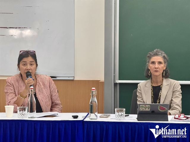 Bà Ramla Khalidi, Trưởng đại diện thường trú (phải) và bà Đỗ Lê Thu Ngọc, Trưởng Phòng Tăng trưởng bao trùm, UNDP tại Việt Nam thông tin về báo cáo, sáng 2/12 tại VinUni. Ảnh: Du Lam |