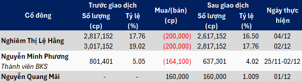 Giai đoạn 25/11-02/12, Thành viên BKS Nguyễn Minh Phương bán ra 164 ngàn cp nhằm giảm sở hữu tại Công ty, đưa số lượng nắm giữ từ hơn 801 ngàn cp (tỷ lệ 5.05%) xuống còn hơn 637 ngàn cp (tỷ lệ 4.02%), và không còn là cổ đông lớn. Đáng nói, ban đầu, ông Phương đăng ký bán 200 ngàn cp STW, nhưng chỉ thực hiện 82% kế hoạch với lý do cổ phiếu không có thanh khoản.