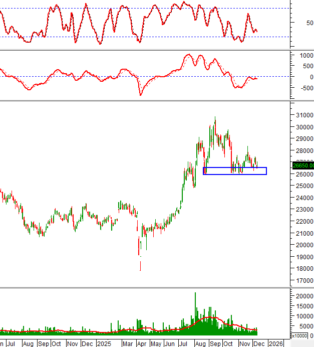 Đáy cũ tháng 10/2025 (tương đương vùng 26,000-26,500) đang đóng vai trò hỗ trợ mạnh. Việc mua vào khi giá test vùng này được ủng hộ.