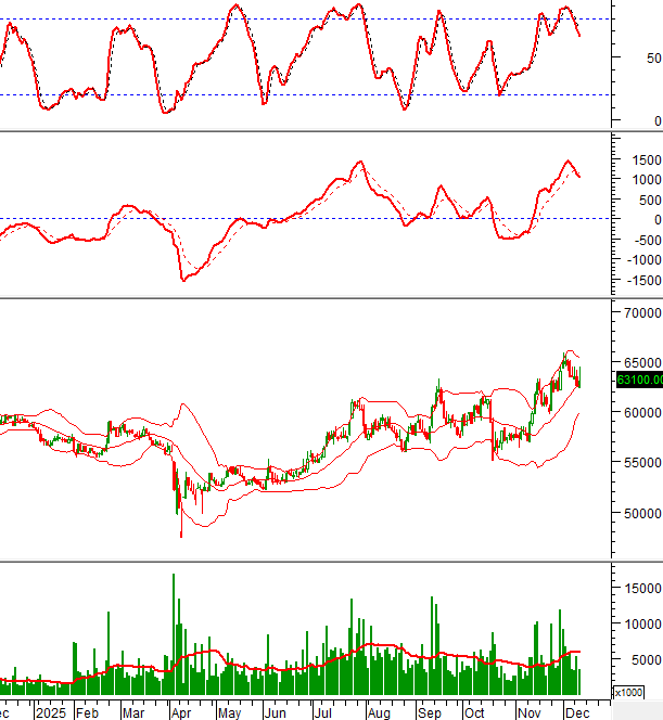 Giá cổ phiếu VCB tăng nhẹ trong phiên giao dịch ngày 10/12/2025 và test lại đường Middle của Bollinger Bands.
