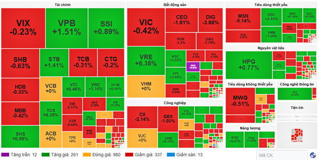 Sắc xanh bao phủ phần lớn các cổ phiếu trong rổ VN30, tiêu biểu như các mã VRE, HPG, VIC, VPB và VNM khi lần lượt góp vào 2.87 điểm, 2.75 điểm, 2.17 điểm, 1.88 điểm và 1.5 điểm vào chỉ số chung. Sắc đỏ chỉ còn hiện diện ở LPB, SSB và BCM nhưng mức tác động tiêu cực không đáng kể.