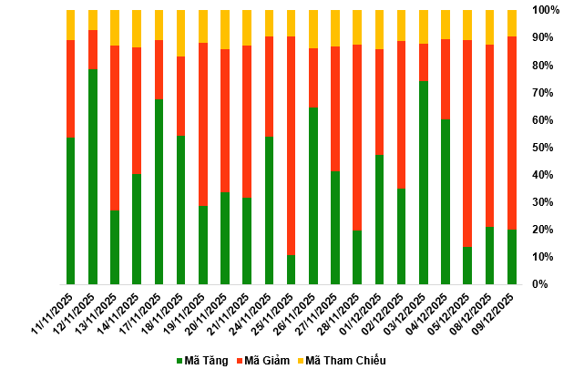 Kết thúc phiên giao dịch ngày 09/12/2025, toàn thị trường có 55 mã tăng, 194 mã giảm và 25 mã tham chiếu.