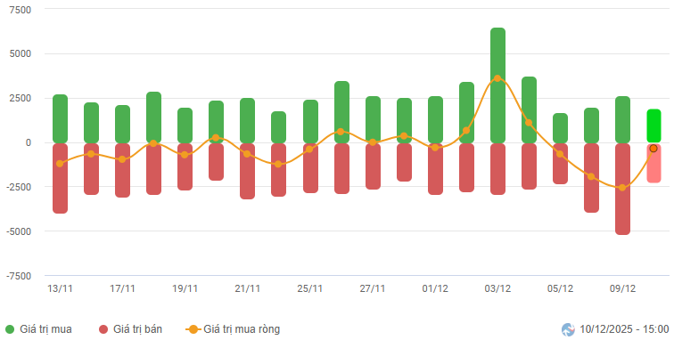 Biến động của dòng tiền từ khối ngoại: Khối ngoại tiếp tục bán ròng trong phiên giao dịch ngày 10/12/2025. Nếu nhà đầu tư nước ngoài duy trì hành động này trong những phiên tới thì tình hình sẽ càng trở nên bi quan hơn.