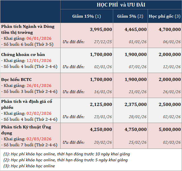 - 4 khóa trở lên/hoặc là hội viên VAFE: Giảm thêm 20%