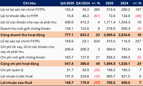 Quý 4/2025, Chứng khoán Mirae Asset (Việt Nam) lãi ròng gần 150 tỷ đồng, giảm 17% so với cùng kỳ. Công ty vẫn đạt mức tăng trưởng 7% cho năm 2025, nhưng kết quả quý 4 phần nào ảnh hưởng tới việc hoàn thành kế hoạch cả năm.