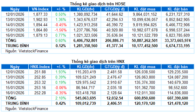 Giao dịch: Các chỉ số chính tăng giảm trái chiều trong phiên giao dịch ngày 16/01. Cụ thể, VN-Index tăng 0.77%, lên mức 1,879.13 điểm; trong khi HNX-Index giảm 0.35%, xuống còn 252.28 điểm. Xét cho cả tuần, VN-Index giữ được mức tăng nhẹ 11.23 điểm (+0.6%) so với tuần trước, còn HNX-Index phục hồi sau 3 tuần giảm liên tiếp với 5.18 điểm tăng (+2.1%).