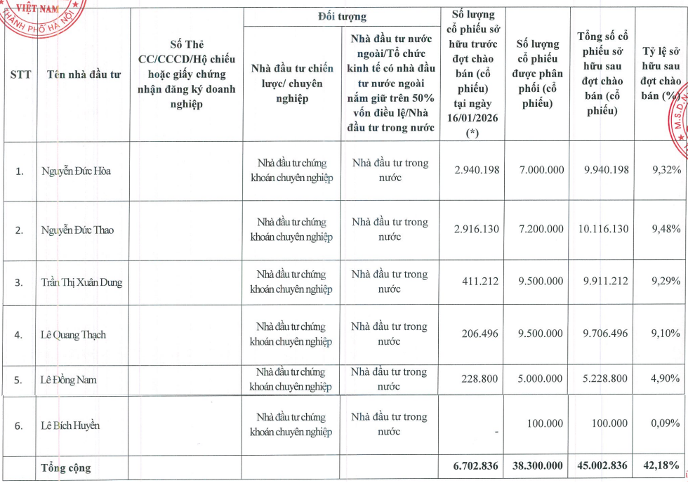 Trong đó, 4 nhà đầu tư trở thành cổ đông lớn với tỷ lệ sở hữu từ 9.1-9.32%. Cổ phiếu mua từ đợt chào bán này bị hạn chế chuyển nhượng trong 1 năm.