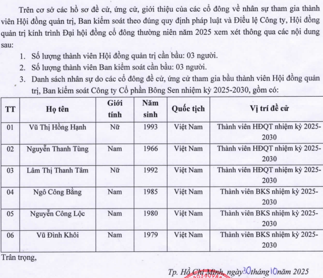 Dù vậy, ĐHĐCĐ thường niên 2025 của Bông Sen không thể diễn ra vào ngày 12/11/2025 như đã thông báo vì lý do khách quan, dẫn đến việc bổ nhiệm Tổng Giám đốc mới vẫn còn để ngỏ. HĐQT Công ty cho biết sẽ chuyển tổ chức vào thời gian khác phù hợp hơn.