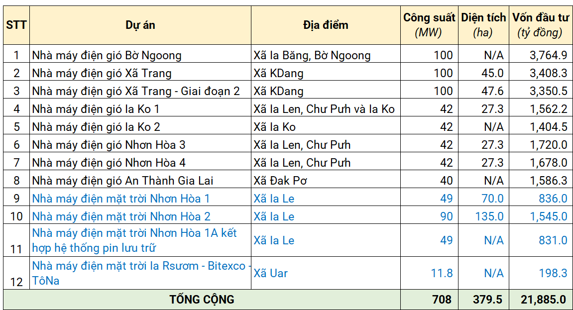 Cả 12 nhà máy điện gió, điện mặt trời trên sẽ cung cấp sản lượng điện sạch từ nguồn năng lượng tái tạo cho hệ thống điện quốc gia, góp phần đảm bảo an ninh năng lượng quốc gia, đảm bảo nguồn điện cung cấp phục vụ nhu cầu phát triển kinh tế - xã hội của tỉnh Gia Lai; đồng thời, giảm tổn thất điện năng trong hệ thống truyền tải điện. Thời hạn hoạt động của dự án 50 năm, kể từ ngày có quyết định cho thuê đất.