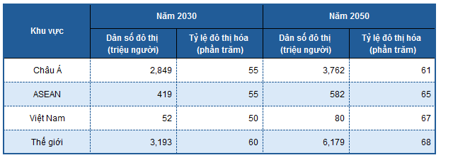 Kết quả dự báo sơ bộ dân số đô thị và đô thị hóa của PGS.TS.KTS Trần Trọng Hanh (Nguyên Hiệu trưởng Trường ĐH Kiến trúc Hà Nội) cho thấy phải đến năm 2050, tỷ lệ đô thị hóa nước ta mới có thể tiệm cận được tỷ lệ đô thị hóa trung bình của thế giới và các nước trong khu vực (tham khảo bảng bên dưới).