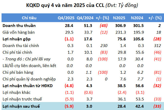 Kết quả, CCL lỗ ròng gần 6 tỷ đồng, đảo chiều so với mức lãi 3 tỷ đồng cùng kỳ và cũng là quý đầu tiên Doanh nghiệp lỗ.
