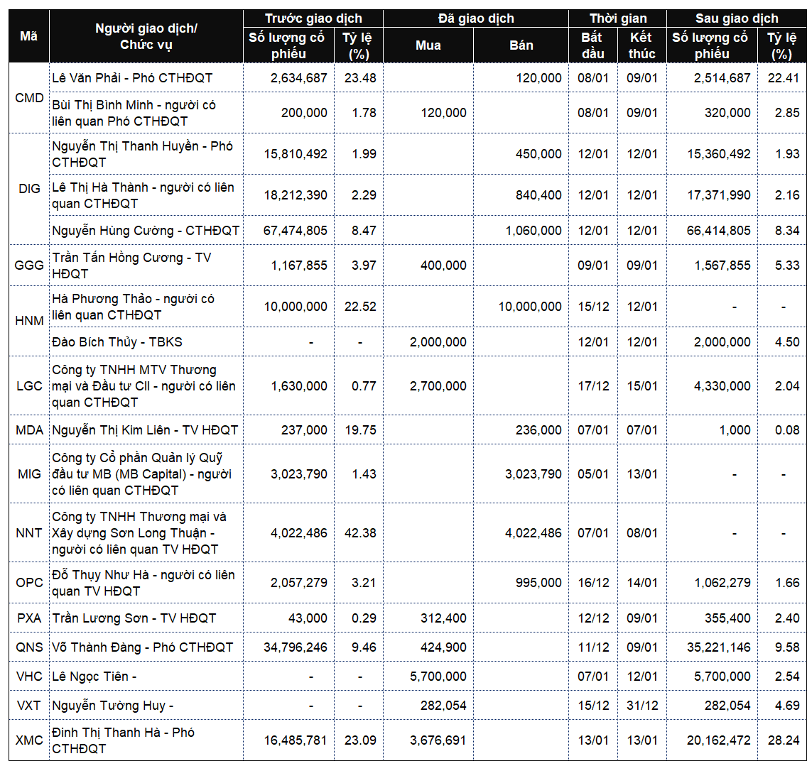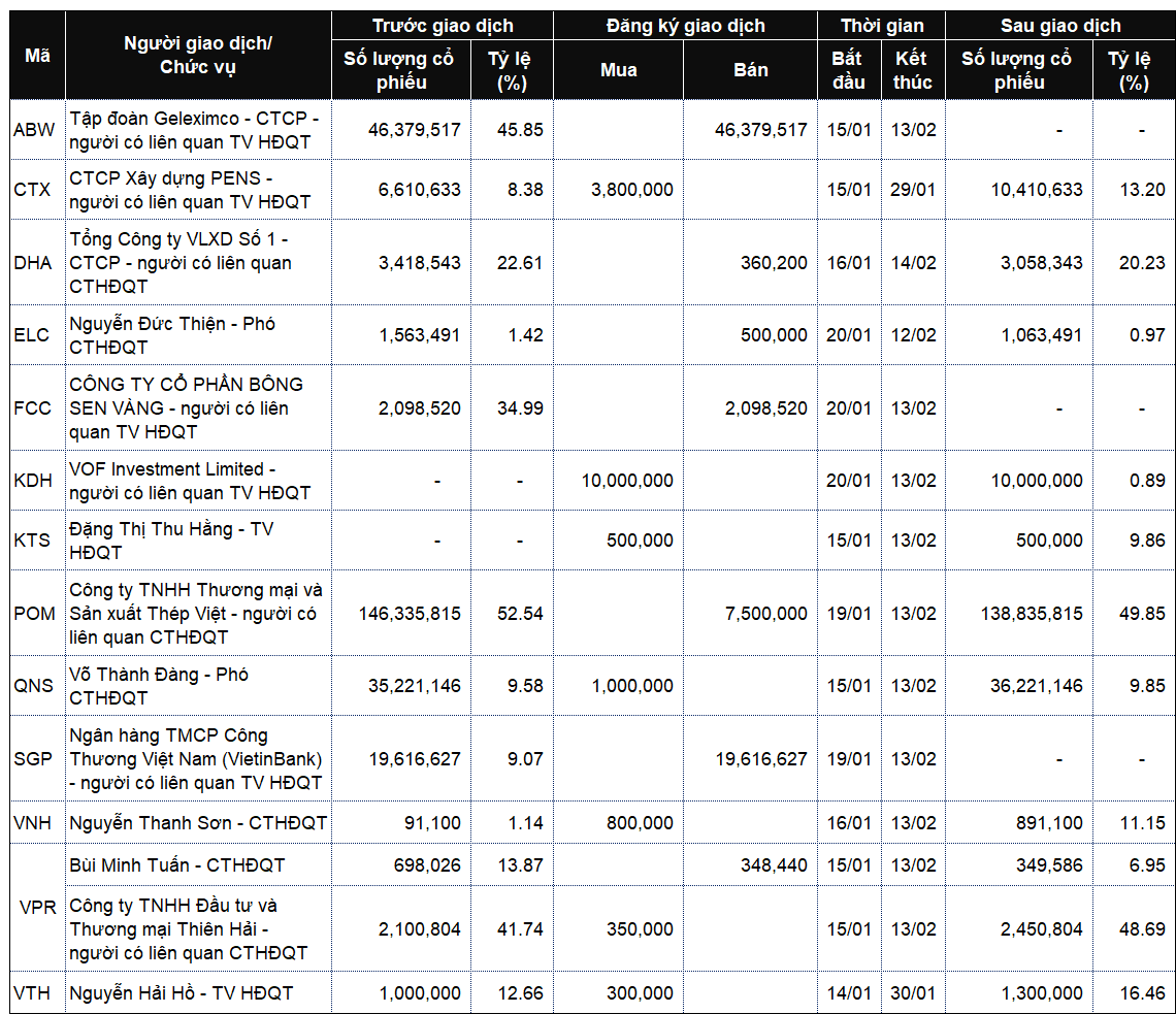 Danh sách lãnh đạo công ty và người thân giao dịch từ ngày 12-16/1/2026