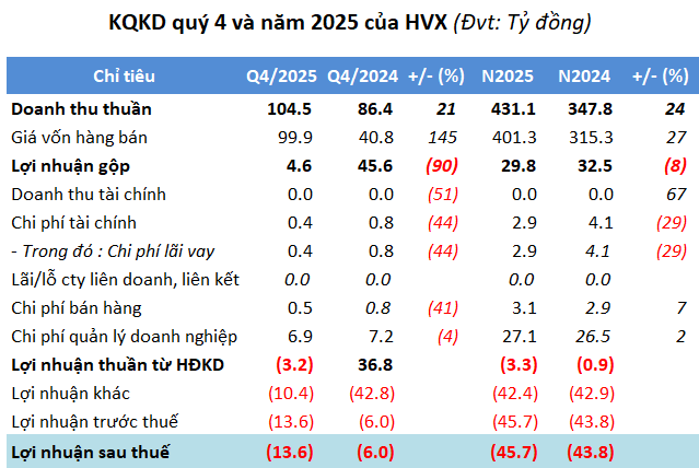 Lũy kế cả năm 2025, doanh thu thuần HVX đạt hơn 431 tỷ đồng, tăng 24% so với năm trước, nhưng vẫn lỗ ròng gần 46 tỷ đồng, cũng là năm lỗ thứ 3 liên tiếp. Tính đến cuối 2025, HVX lỗ lũy kế hơn 142 tỷ đồng, tổng tài sản giảm 13% so với đầu năm còn gần 527 tỷ đồng.