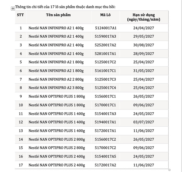 Danh mục sản phẩm thuộc diện thu hồi bao gồm 17 lô cụ thể của hai dòng chính là Nestlé NAN INFINIPRO A2 (bước 1, 2, 3) và Nestlé NAN OPTIPRO PLUS (bước 1, 2) với các trọng lượng 400g và 800g.
