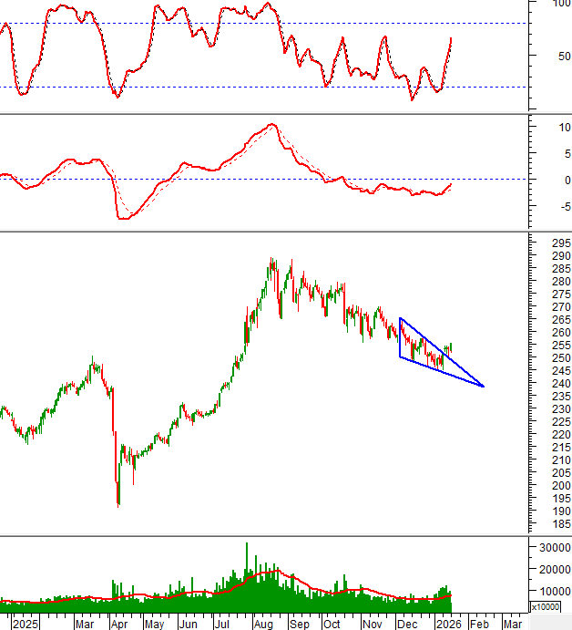 Bên cạnh đó, chỉ báo MACD liên tục tạo các đỉnh và đáy mới cao hơn (Higher High, Higher Low). Nếu các tín hiệu kỹ thuật tiếp tục khởi sắc và giá cổ phiếu vẫn duy trì đà tăng trung hạn thì mục tiêu giá tiềm năng là vùng 78,500-81,500.