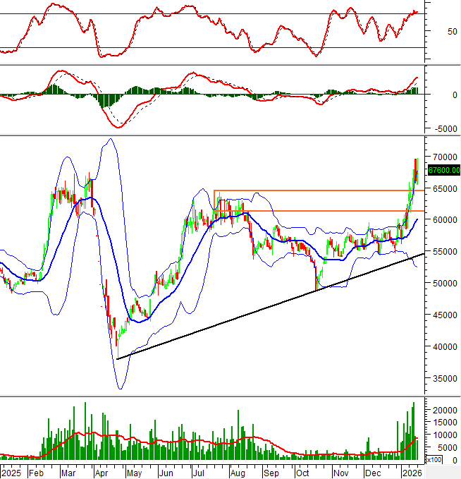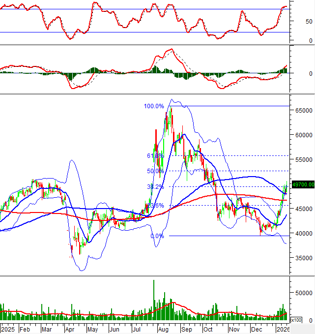 Hiện tại, giá cổ phiếu này tiếp tục bám sát dải trên (Upper Band) của Bollinger Bands và đang kiểm tra lại ngưỡng Fibonacci Retracement 38.2% (tương đương vùng 50,000-52,000).