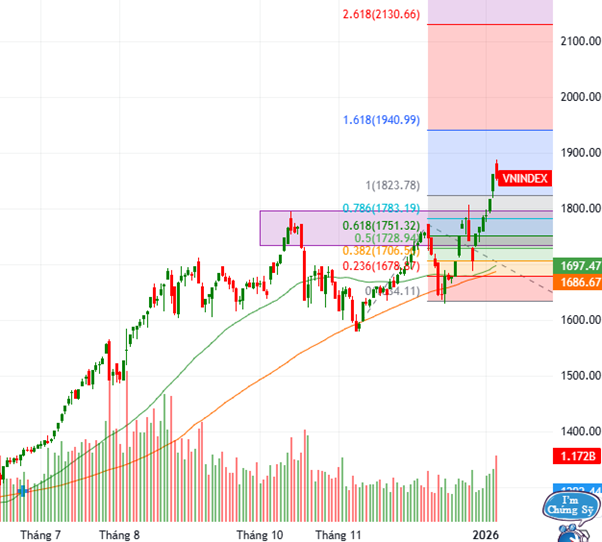 Mục tiêu trong ngắn hạn là vùng 1,935-1,950 điểm. Tuy nhiên, người viết kỳ vọng năm 2026 sẽ hướng đến mục tiêu lớn là vùng 2,125-2,135 điểm.