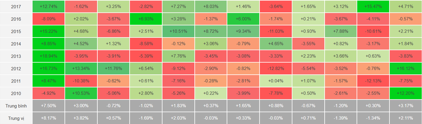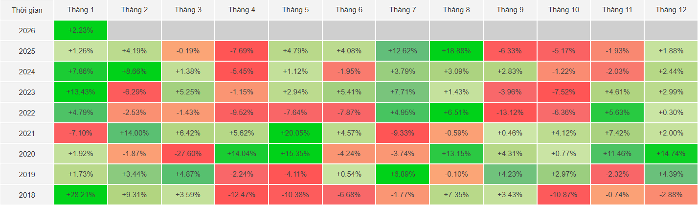 Cụ thể, mức sinh lời trung bình của tháng giêng đạt khoảng 7.5%, đóng vai trò là tháng có hiệu suất tốt nhất trong năm. Hiện tượng này không chỉ phản ánh sự hưng phấn của nhà đầu tư sau kỳ nghỉ lễ mà còn là kết quả của việc tái cơ cấu danh mục (Portfolio Rebalancing) và dòng vốn mới gia nhập thị trường đầu niên độ tài chính.