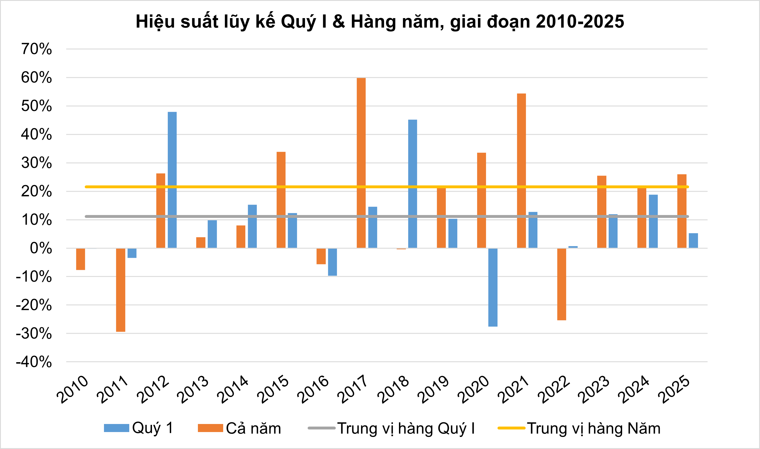 Mở rộng khung phân tích sang toàn bộ quý I, số liệu thống kê cho thấy hiệu suất của ngành tài chính thường có xu hướng tập trung mạnh vào nửa đầu quý. Mức sinh lời lũy kế trung vị của quý I đạt hơn 11%, tuy nhiên sự phân bổ lợi nhuận này không đồng đều.
