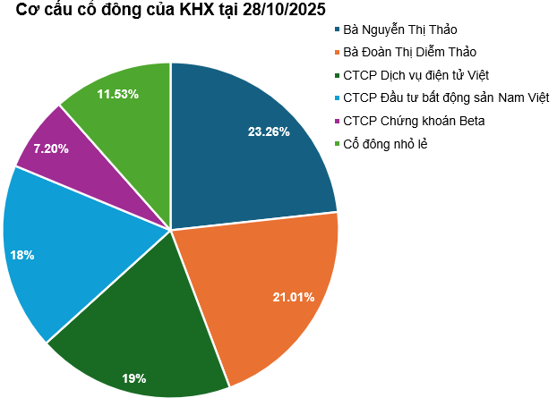 Theo danh sách cổ đông tại ngày 28/10/2025, các cổ đông lớn còn lại gồm bà Nguyễn Thị Thảo sở hữu 23.26% vốn; bà Đoàn Thị Diễm Thảo nắm giữ 21.01%; CTCP Đầu tư Bất động sản Nam Việt sở hữu 18% và CTCP Chứng khoán Beta nắm 7.2% vốn điều lệ.