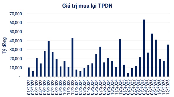 Trong tháng 12/2025, các doanh nghiệp đã mua lại gần 35.8 ngàn tỷ đồng trái phiếu trước hạn, giảm 15% so với cùng kỳ năm trước. Trong năm 2026, giá trị đáo hạn ước tính là hơn 206 ngàn tỷ đồng.