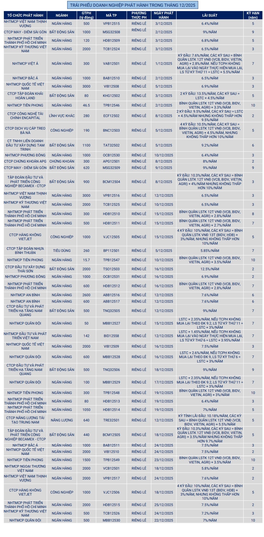 Theo dữ liệu VBMA tổng hợp từ HNX và SSC, tính đến ngày 31/12/2025, có tổng cộng 68 đợt phát hành trái phiếu doanh nghiệp (TPDN), gồm 62 đợt phát hành riêng lẻ trị giá gần 58.7 ngàn tỷ đồng, và 6 đợt phát hành ra công chúng trị giá hơn 3.77 ngàn tỷ đồng trong tháng 12/2025.