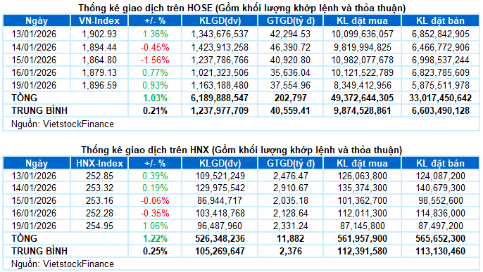 - Các chỉ số chính đồng loạt tăng điểm trong phiên giao dịch ngày 19/01. VN-Index tăng 0.93%, lên mức 1,896.59 điểm; HNX-Index đạt 254.95 điểm, tăng 1.06%.