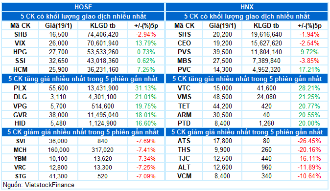 - Thị trường khởi động phiên giao dịch ngày 19/01 với trạng thái tích cực khi VN-Index nhanh chóng tiến lên vùng 1,895 điểm. Tuy nhiên, đà tăng sau đó bị kìm hãm đáng kể bởi sự suy yếu của nhóm cổ phiếu vốn hóa lớn, khiến chỉ số đánh mất phần lớn thành quả có được trong nửa đầu phiên sáng và rơi vào trạng thái giằng co. Bước sang phiên chiều, lực cầu dần cải thiện tại các cổ phiếu dẫn dắt giúp VN-Index phục hồi trở lại và duy trì sắc xanh đến cuối phiên. Chỉ số đóng cửa tại 1,896.59 điểm, tăng 0.93% so với phiên trước.
