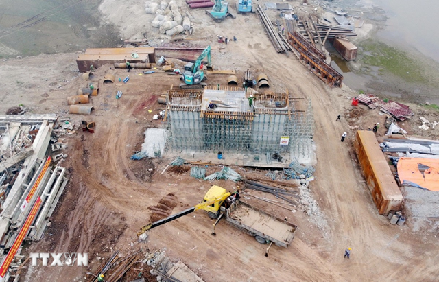 Sau 3 tháng khởi công, nhà thầu thi công cầu Phong Châu mới đã tập trung nhân lực, máy móc để đẩy nhanh tiến độ, phấn đấu hoàn thành trước kế hoạch đề ra. (Ảnh: Tạ Toàn/TTXVN)