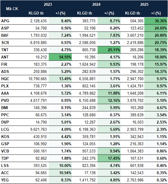 Theo dữ liệu từ VietstockFinance, có đến 23 cổ phiếu trên sàn HOSE luôn tăng trong tháng 2 của 3 năm (2023-2025), một số cái tên nổi bật có thể kể đến như: SCR, HQC của nhóm bất động sản; VCB nhóm ngân hàng; PLX, PVD nhóm xăng dầu; BMI nhóm bảo hiểm; LSS nhóm mía đường;…