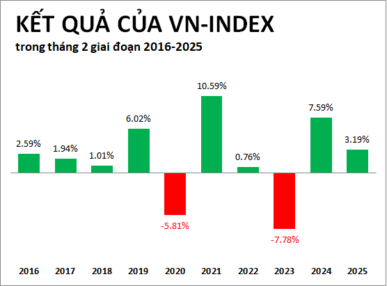 Không chỉ chênh lệch ở số cổ phiếu thường tăng và giảm, sự thuận lợi của VN-Index trong tháng 2 còn được thể hiện ở lịch sử suốt 1 thập kỷ qua, từ 2016-2025. Cụ thể, chỉ số có đến 8 năm kết thúc tháng 2 với kết quả tăng điểm, lần cuối giảm điểm đã từ năm 2023.
