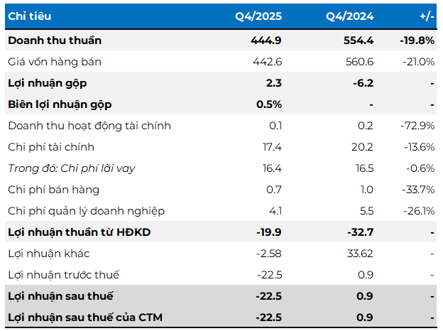 Doanh thu thuần đạt gần 450 tỷ đồng, giảm gần 20% so với cùng kỳ năm trước.