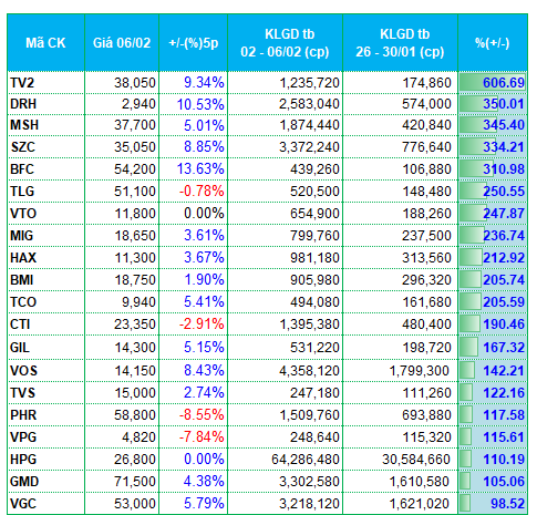 Nhóm xây dựng cũng có diễn biến phân hóa tương tự với đà tăng của các mã TV2, DRH, SJE, MST hay nhóm vật liệu xây dựng như VGC, GKM. TV2 nổi trội với mức tăng khối lượng giao dịch lên tới hơn 600%, đạt 1.2 triệu đơn vị/phiên. DRH cũng bứt phá mạnh, đạt mức thanh khoản gần 2.6 triệu đơn vị/phiên, tăng 350% so với tuần trước.