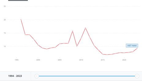 Biểu đồ lãi suất cho vay tại Việt Nam giai đoạn 1994 - 2024 (Nguồn: World Bank)