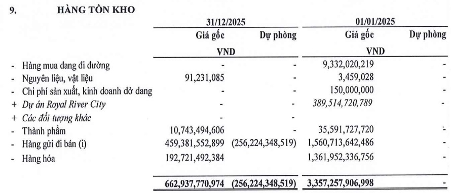 Hàng tồn kho cũng giảm sâu 80%, về gần 663 tỷ đồng, trong đó Công ty trích lập dự phòng giảm giá hàng tồn kho hơn 256 tỷ đồng. Theo thuyết minh, khoản trích lập này liên quan đến giá trị hàng gửi đi bán là than nhiệt giao trong tháng 4/2025 cho Chi nhánh phát điện dầu khí – Tập đoàn Công nghiệp – Năng lượng Quốc gia Việt Nam (Petrovietnam), theo hợp đồng số 1556/2024/PVPBGSH1TPP-VPG-PINE ký ngày 06/09/2024, về việc mua than phục vụ vận hành thương mại Nhà máy nhiệt điện Sông Hậu 1 giai đoạn 2024-2025. Tính đến thời điểm lập BCTC hợp nhất quý 4/2025, các bên vẫn đang làm việc để xác định giá trị thanh toán cho các lô hàng cuối và tiến hành thanh lý hợp đồng sau khi có kết luận của cơ quan có thẩm quyền.